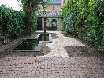 bomen en struiken te handhaven zodat je gelijk met grotere/ volgroeide struiken, bomen en klimmers kunt beginnen. Dan oogt een tuin ook direct groener. Er was ooit een kleine vijver geweest en de wens was om weer water in de tuin hebben. Naast hergebruik van de aanwezige bestrating wilde de familie een rustieke, engels aandoende tuin. Naast een lijst met beplantingswensen is er veel overleg geweest over de invulling. De aanwezige bestrating lag in kalkmortel en kwam zo slecht / beschadigd uit de grond dat hergebruik is ontraden. In overleg op zoek gegaan naar oudere klinkers en na inspectie zijn deze gelegd. Ziehier het kale resultaat. Beplanting volgt...