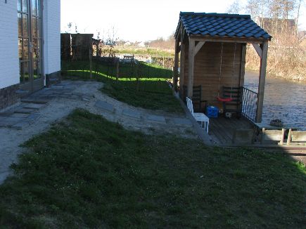 De tuin die Martien net heeft aangelegd had een groot hoogteverschil tussen huis en beschoeiing. Ook was de tuin niet erg diep / lang, gekozen is voor een oplossing met duidelijke trap met 'luie' treden